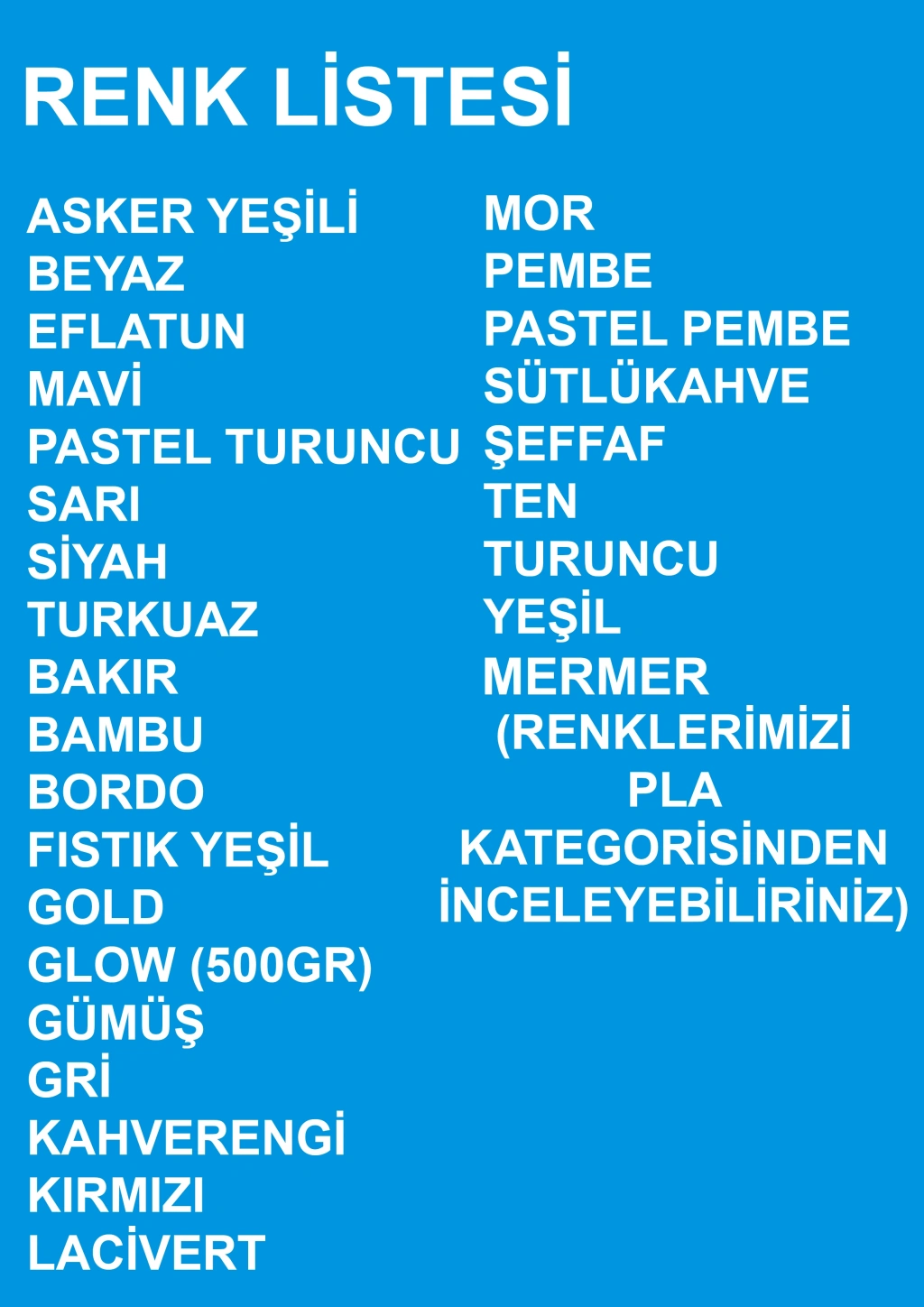 Geniş renk seçeneği: İstanbul filament, birçok farklı renkte bulunabilir. Bu, kullanıcıların yaratıcılıklarını sergileyebilecekleri ve çeşitli projeler için istedikleri renkleri seçebilecekleri anlamına gelir.