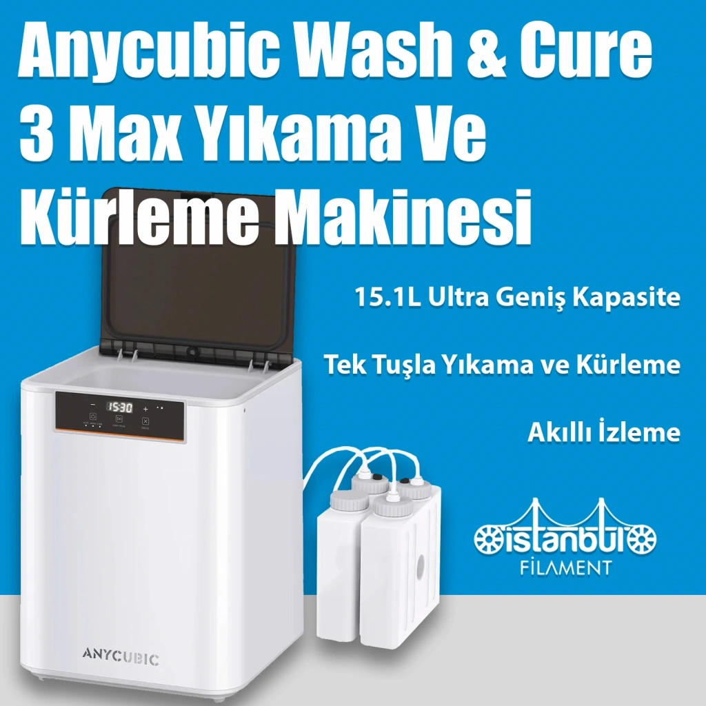 Anycubic Wash & Cure 3 Max, büyük formatlı reçine 3D baskılar için tasarlanmış gelişmiş bir post‑işleme çözümüdür. Yıkama ve UV kürleme işlemlerini tek cihazda tam otomatik şekilde gerçekleştirir. Geniş hacmi, yüksek güç ışıklandırma sistemi ve akıllı sensörleriyle hem hobi seviyesindeki kullanıcılar hem de küçük atölye/seri üretim ortamları için uygundur.