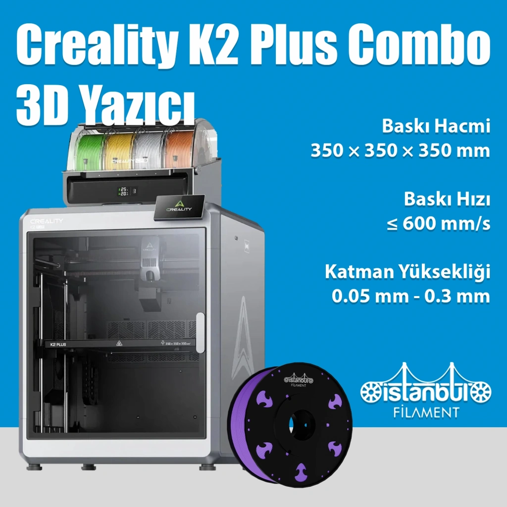 Creality K2 Plus Combo, yüksek hızda ve büyük hacimlerde baskı almak isteyen kullanıcılar için geliştirilmiş profesyonel bir FDM 3D yazıcıdır. “Combo” ibaresi, cihazın Creality Filament Sistemi (CFS) ile uyumlu olduğunu ve çok renkli baskı yapabildiğini ifade eder. Geniş baskı hacmi, güçlü ısı kontrolü, tam otomatik kalibrasyon ve gelişmiş AI destekli izleme özellikleri sayesinde hem amatör hem de profesyonel kullanımda üst düzey performans sunar.