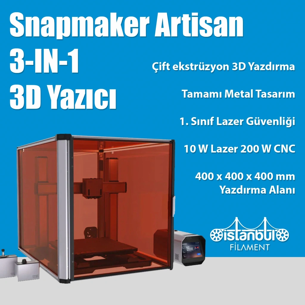 Snapmaker Artisan 3‑in‑1, 3D baskı, lazer gravür ve CNC oyma/modül değişimi ile tek bir cihazda zengin bir üretim deneyimi sunar. Modüler yapısı sayesinde, kullanıcılar ihtiyaçlarına göre yazıcıyı kolayca yapılandırabilir. Tam metal gövdesi ve büyük yapı alanı ile hem yaratıcı projeler hem de profesyonel uygulamalar için uygundur.