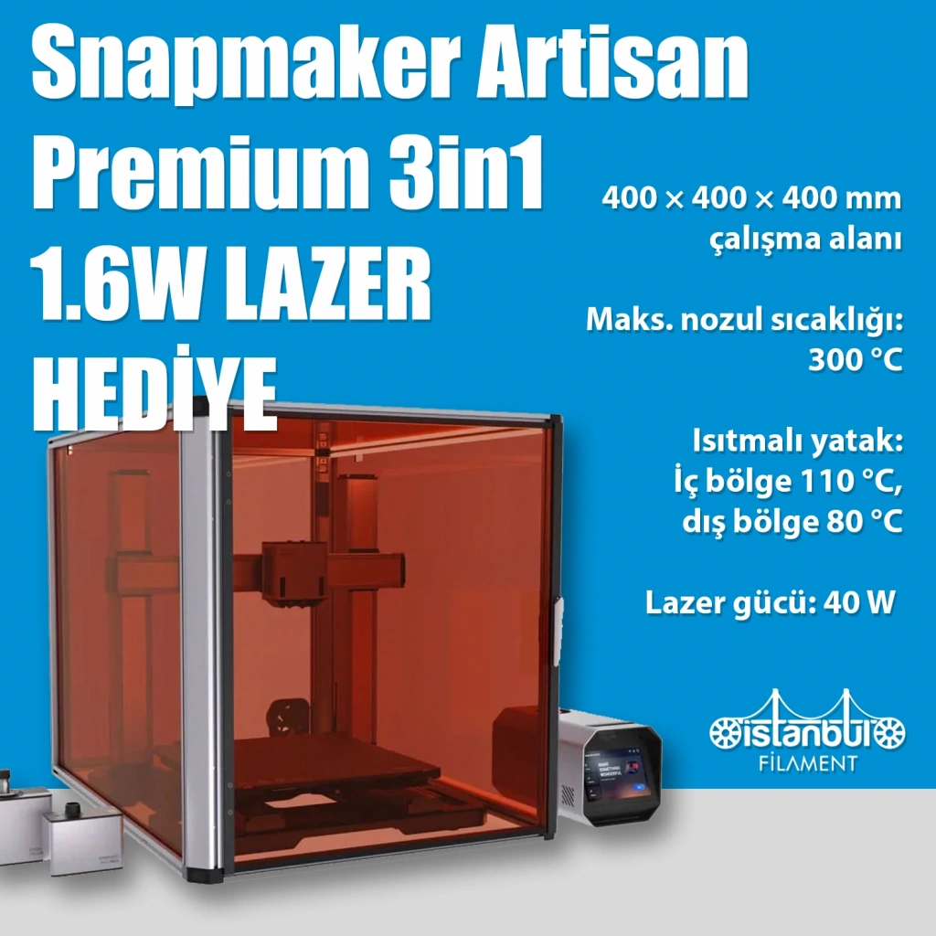 Snapmaker Artisan Premium, 3D baskı, lazer kazıma ve CNC gravür işlemlerini tek bir cihazda birleştiren çok fonksiyonlu bir üretim aracıdır. Gelişmiş tasarımı, geniş baskı hacmi ve yüksek hassasiyetli mekanik yapısı ile hem hobi kullanıcıları hem de profesyonel tasarımcılar için ideal bir çözümdür. 3D baskı modunda geniş alan sunan platformu, büyük ve detaylı projeleri tek seferde üretmenize olanak tanır ve her baskıda pürüzsüz, stabil sonuçlar sağlar.